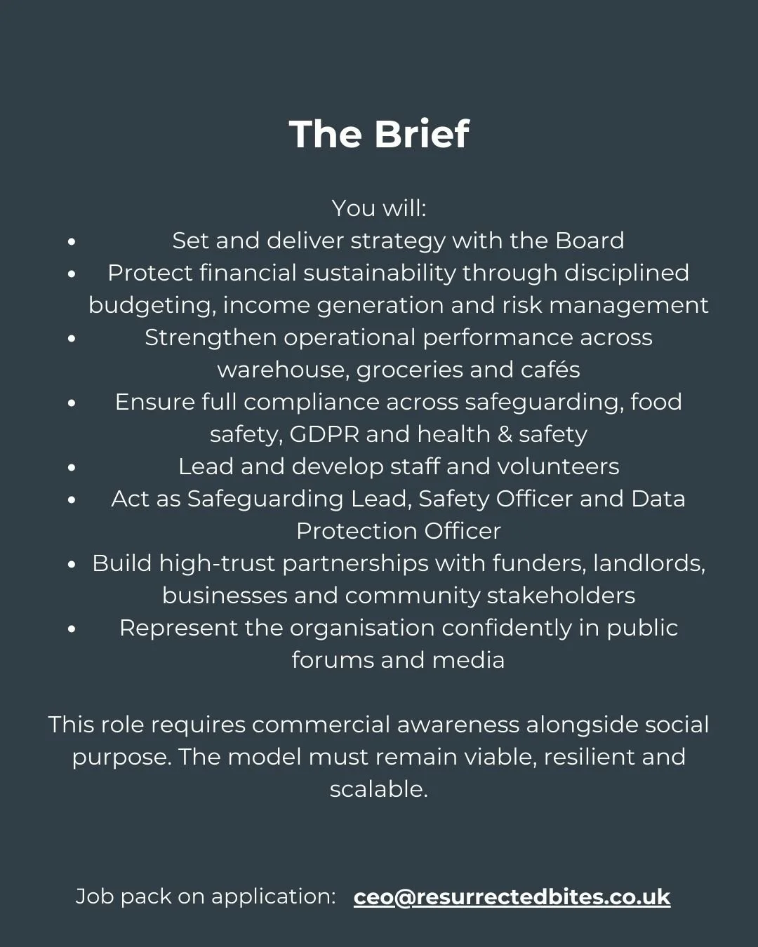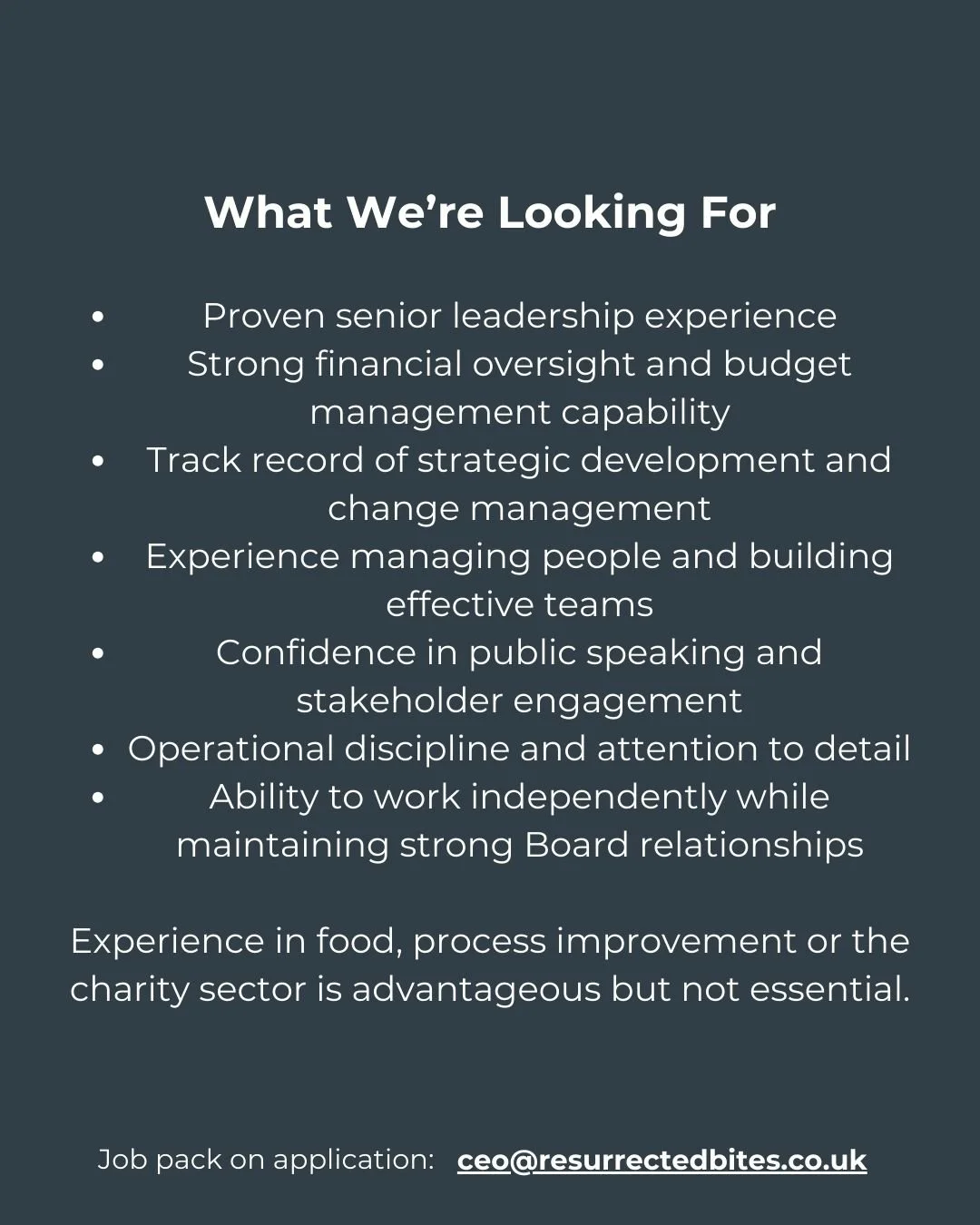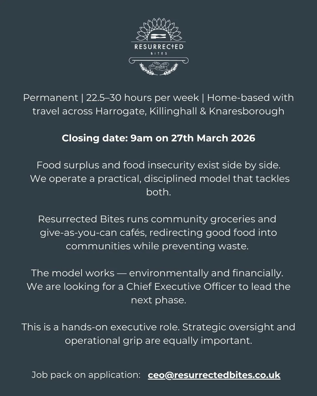 “Resurrected Bites has proven that a practical, well-run model can reduce food waste and improve access to affordable food and tackle loneliness, all at the same time. We are now looking for a new Chief Executive who can strengthen what we’ve built and position us for long-term resilience.”